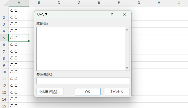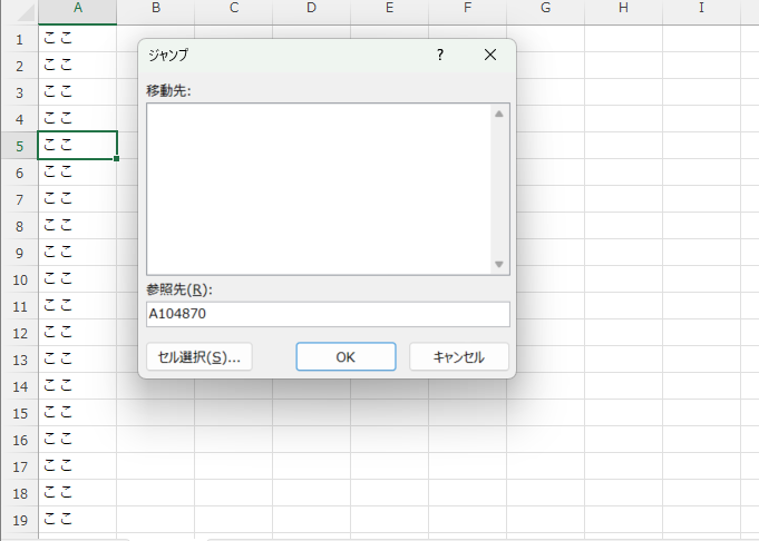 Excelファイル上で、キー操作により指定行に移動(ジャンプ)する方法です。(意外に忘れるんですよね・・・)