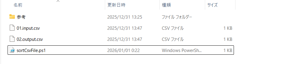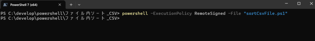 PowerShellのターミナルからSortCsvFile.ps1を実行するコマンドを打ちます。