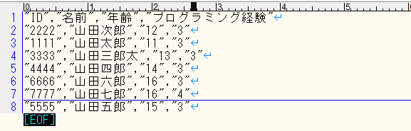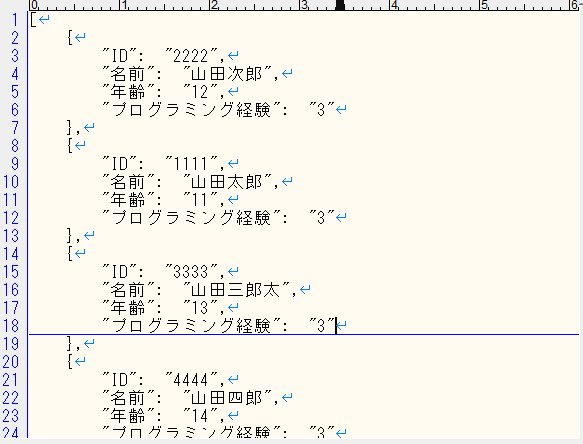 JSONファイルの中身は、同じ項目名で値が異なるレコードがいくつか定義されています。