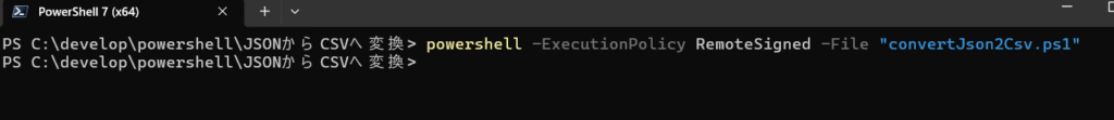 PowerShellのターミナルからconvertJson2Csv.ps1を実行するコマンドを打ちます。