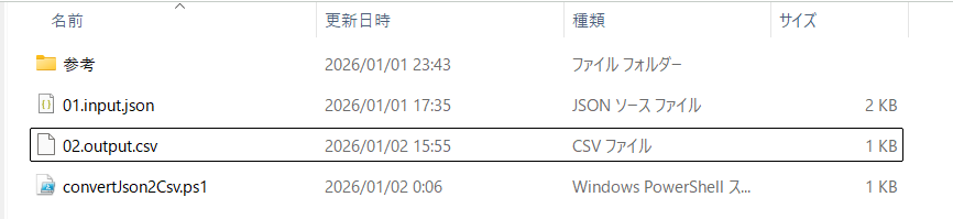 実行すると、出力ファイル「02.output.csv」が作成されます。※既にある場合は上書きされます。
