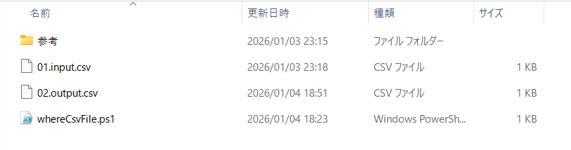 実行すると、出力ファイル「02.output.csv」が作成されます。※既にある場合は上書きされます。