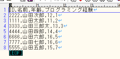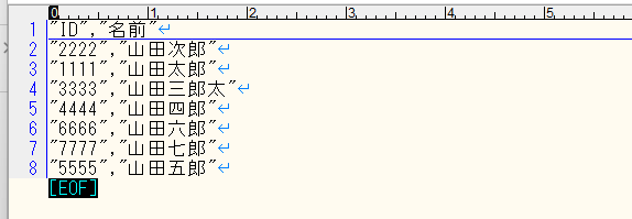 出力ファイルのCSVは「ID」と「名前」の列の実が出力されています。