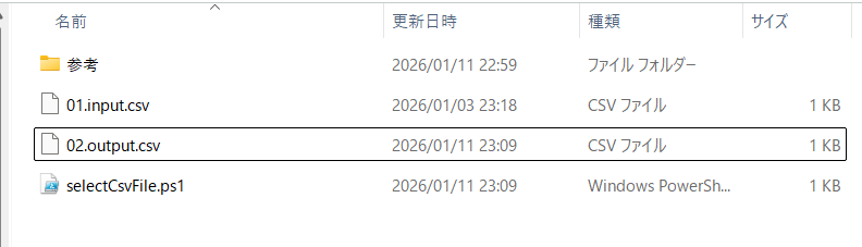 実行すると、出力ファイル「02.output.csv」が作成されます。※既にある場合は上書きされます。