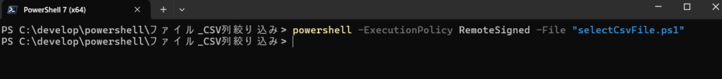 PowerShellのターミナルからwhereCsvFile.ps1を実行するコマンドを打ちます。